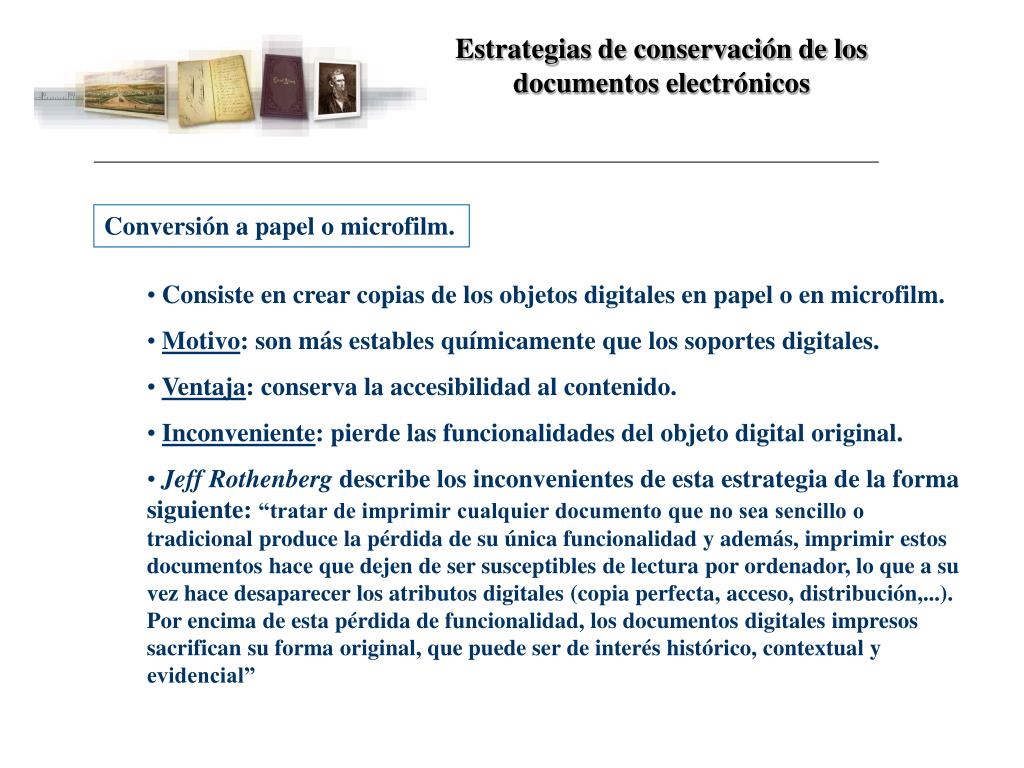 Estrategias de conservación de los documentos electrónicos Conversión a papel o microfilm. • Consiste en crear copias de los objetos digitales en papel o en microfilm. • Motivo: son más estables químicamente que los soportes digitales. • Ventaja: conserva la accesibilidad al contenido. • Inconveniente: pierde las funcionalidades del objeto digital original. • Jeff Rothenberg describe los inconvenientes de esta estrategia de la forma siguiente: “tratar de imprimir cualquier documento que no sea sencillo o tradicional produce la pérdida de su única funcionalidad y además, imprimir estos documentos hace que dejen de ser susceptibles de lectura por ordenador, lo que a su vez hace desaparecer los atributos digitales (copia perfecta, acceso, distribución,...). Por encima de esta pérdida de funcionalidad, los documentos digitales impresos sacrifican su forma original, que puede ser de interés histórico, contextual y evidencial”
