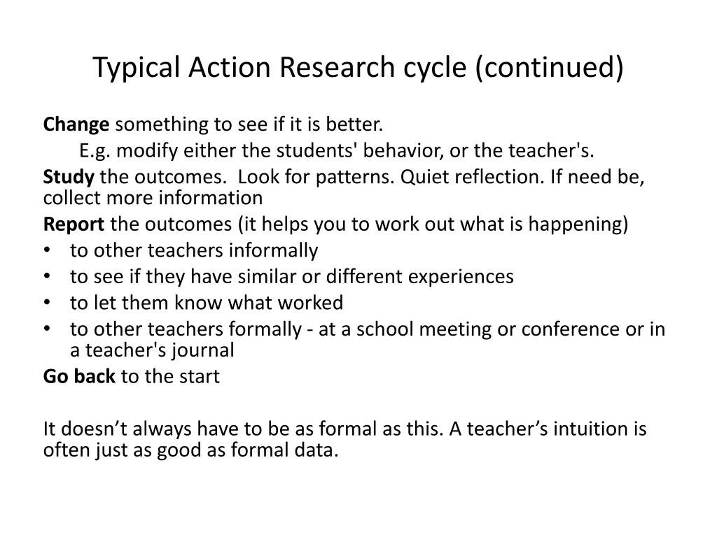 A Typical Action Research Cycle Identify something that is puzzling, it may be a problem or a doubt about a classroom situation. Make this into a question. e.g. Why do some learners get this quickly and other slowly? Could I teach this another way to get better retention? Recordpresent behaviors. Ask … What is happening? What are they doing? Make an educated guess about what is happening Plan an intervention