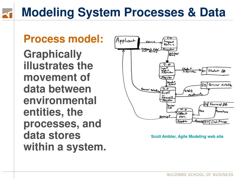 Modeling System Processes & Data Process model:Graphically illustrates the movement of data between environmental entities, the processes, and data stores within a system. Scott Ambler, Agile Modeling web site