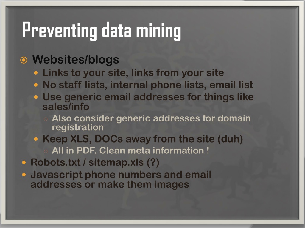 Preventing data mining • Websites/blogs • Links to your site, links from your site • No staff lists, internal phone lists, email list • Use generic email addresses for things like sales/info • Also consider generic addresses for domain registration • Keep XLS, DOCs away from the site (duh) • All in PDF. Clean meta information ! • Robots.txt / sitemap.xls (?) • Javascript phone numbers and email addresses or make them images
