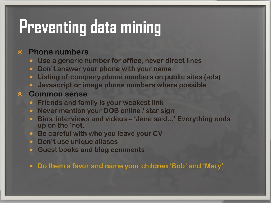 Preventing data mining • Phone numbers • Use a generic number for office, never direct lines • Don’t answer your phone with your name • Listing of company phone numbers on public sites (ads) • Javascript or image phone numbers where possible • Common sense • Friends and family is your weakest link • Never mention your DOB online / star sign • Bios, interviews and videos – ‘Jane said...’ Everything ends up on the ‘net. • Be careful with who you leave your CV • Don’t use unique aliases • Guest books and blog comments • Do them a favor and name your children ‘Bob’ and ‘Mary’
