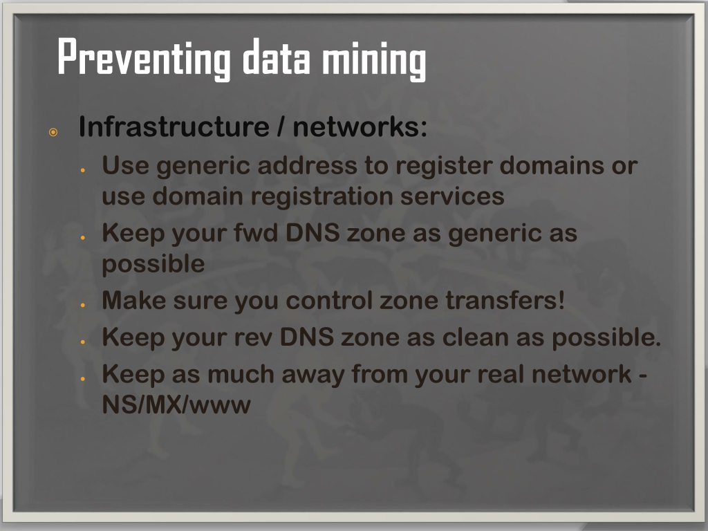 Preventing data mining • Infrastructure / networks: • Use generic address to register domains or use domain registration services • Keep your fwd DNS zone as generic as possible • Make sure you control zone transfers! • Keep your rev DNS zone as clean as possible. • Keep as much away from your real network - NS/MX/www