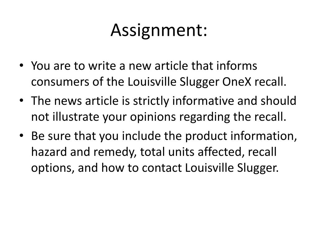 Assignment: • You are to write a new article that informs consumers of the Louisville Slugger OneX recall. • The news article is strictly informative and should not illustrate your opinions regarding the recall. • Be sure that you include the product information, hazard and remedy, total units affected, recall options, and how to contact Louisville Slugger.