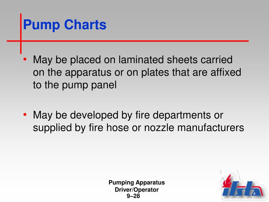 Pump Charts • May be placed on laminated sheets carried on the apparatus or on plates that are affixed to the pump panel • May be developed by fire departments or supplied by fire hose or nozzle manufacturers Pumping Apparatus Driver/Operator
