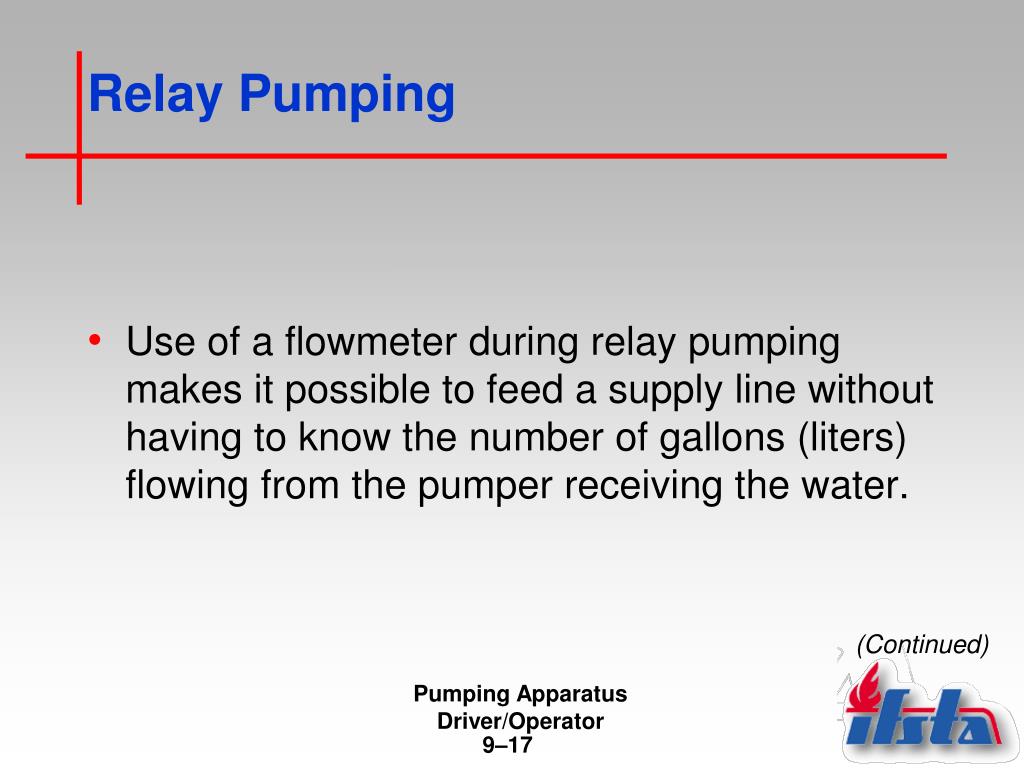 Relay Pumping • Use of a flowmeter during relay pumping makes it possible to feed a supply line without having to know the number of gallons (liters) flowing from the pumper receiving the water. (Continued) Pumping Apparatus Driver/Operator