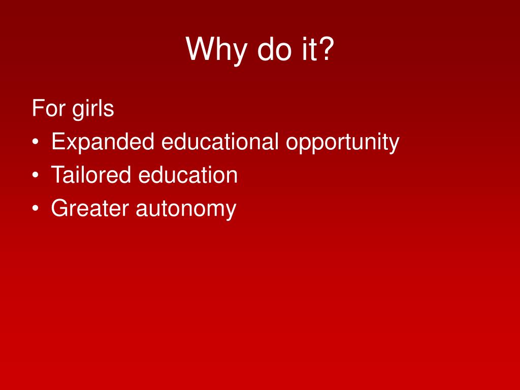 Why do it? For girls • Expanded educational opportunity • Tailored education • Greater autonomy