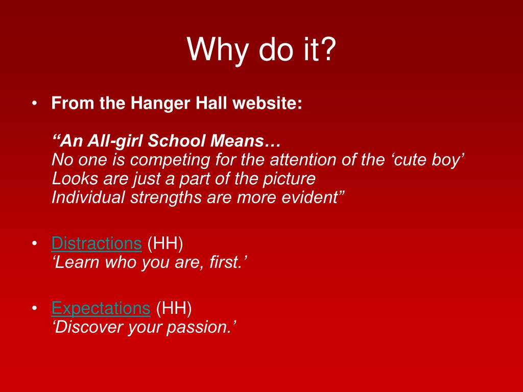 Why do it? • From the Hanger Hall website:“An All-girl School Means…No one is competing for the attention of the ‘cute boy’ Looks are just a part of the picture Individual strengths are more evident” • Distractions (HH) ‘Learn who you are, first.’ • Expectations (HH)‘Discover your passion.’