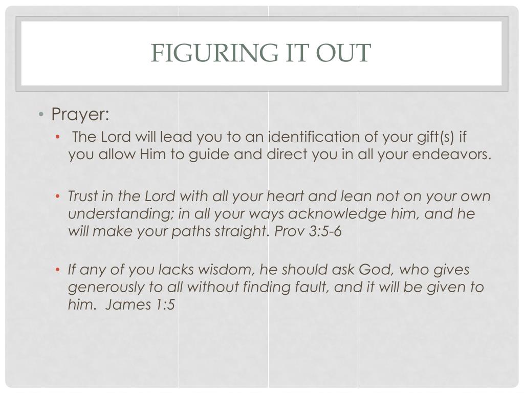 Figuring it out • Prayer: • The Lord will lead you to an identification of your gift(s) if you allow Him to guide and direct you in all your endeavors. • Trust in the Lord with all your heart and lean not on your own understanding; in all your ways acknowledge him, and he will make your paths straight. Prov 3:5-6 • If any of you lacks wisdom, he should ask God, who gives generously to all without finding fault, and it will be given to him. James 1:5