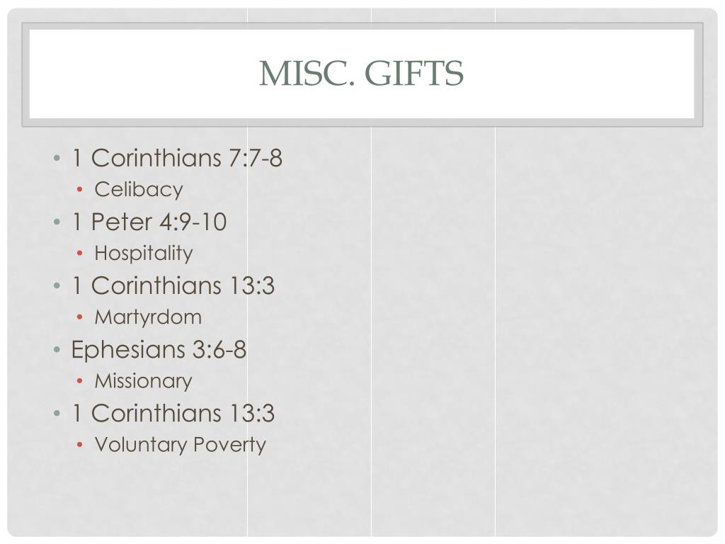 Misc. Gifts • 1 Corinthians 7:7-8 • Celibacy • 1 Peter 4:9-10 • Hospitality • 1 Corinthians 13:3 • Martyrdom • Ephesians 3:6-8 • Missionary • 1 Corinthians 13:3 • Voluntary Poverty