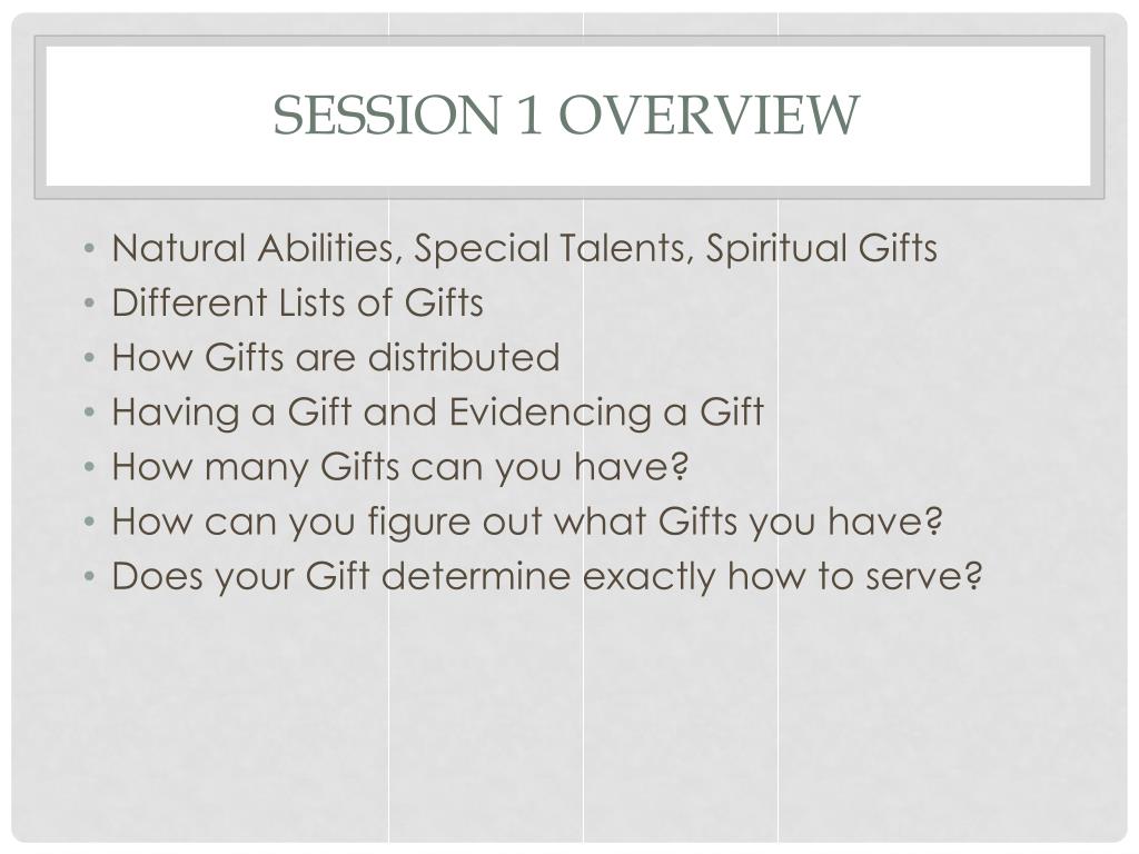 Spiritual Gifts. What God has given you and how to use it. Session 1 Overview. Natural Abilities, Special Talents, Spiritual Gifts Different Lists of Gifts How Gifts are distributed Having a Gift and Evidencing a Gift How many Gifts can you have? How can you figure out what Gifts you have?