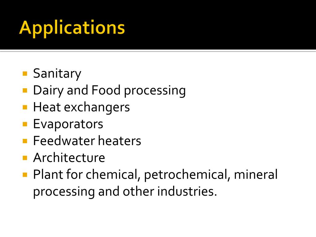 Applications • Sanitary • Dairy and Food processing • Heat exchangers • Evaporators • Feedwater heaters • Architecture • Plant for chemical, petrochemical, mineral processing and other industries.