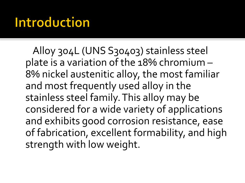 Introduction Alloy 304L (UNS S30403) stainless steel plate is a variation of the 18% chromium – 8% nickel austenitic alloy, the most familiar and most frequently used alloy in the stainless steel family. This alloy may be considered for a wide variety of applications and exhibits good corrosion resistance, ease of fabrication, excellent formability, and high strength with low weight.