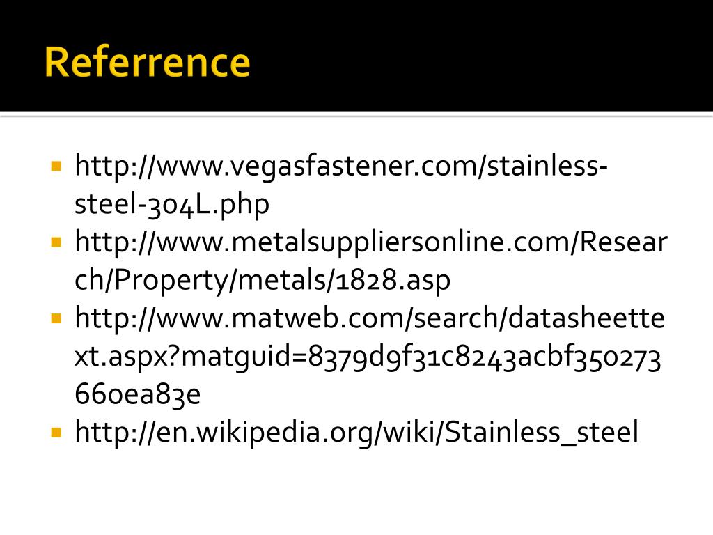 Referrence • http://www.vegasfastener.com/stainless-steel-304L.php • http://www.metalsuppliersonline.com/Research/Property/metals/1828.asp • http://www.matweb.com/search/datasheettext.aspx?matguid=8379d9f31c8243acbf350273660ea83e • http://en.wikipedia.org/wiki/Stainless_steel