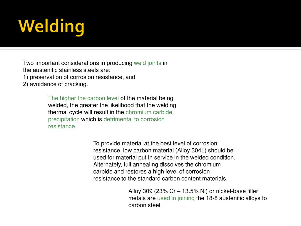 Welding Two important considerations in producing weld joints in the austenitic stainless steels are: 1) preservation of corrosion resistance, and 2) avoidance of cracking. The higher the carbon level of the material being welded, the greater the likelihood that the welding thermal cycle will result in the chromium carbide precipitation which is detrimental to corrosion resistance. To provide material at the best level of corrosion resistance, low carbon material (Alloy 304L) should be used for material put in service in the welded condition. Alternately, full annealing dissolves the chromium carbide and restores a high level of corrosion resistance to the standard carbon content materials. Alloy 309 (23% Cr – 13.5% Ni) or nickel-base filler metals are used in joining the 18-8 austenitic alloys to carbon steel.