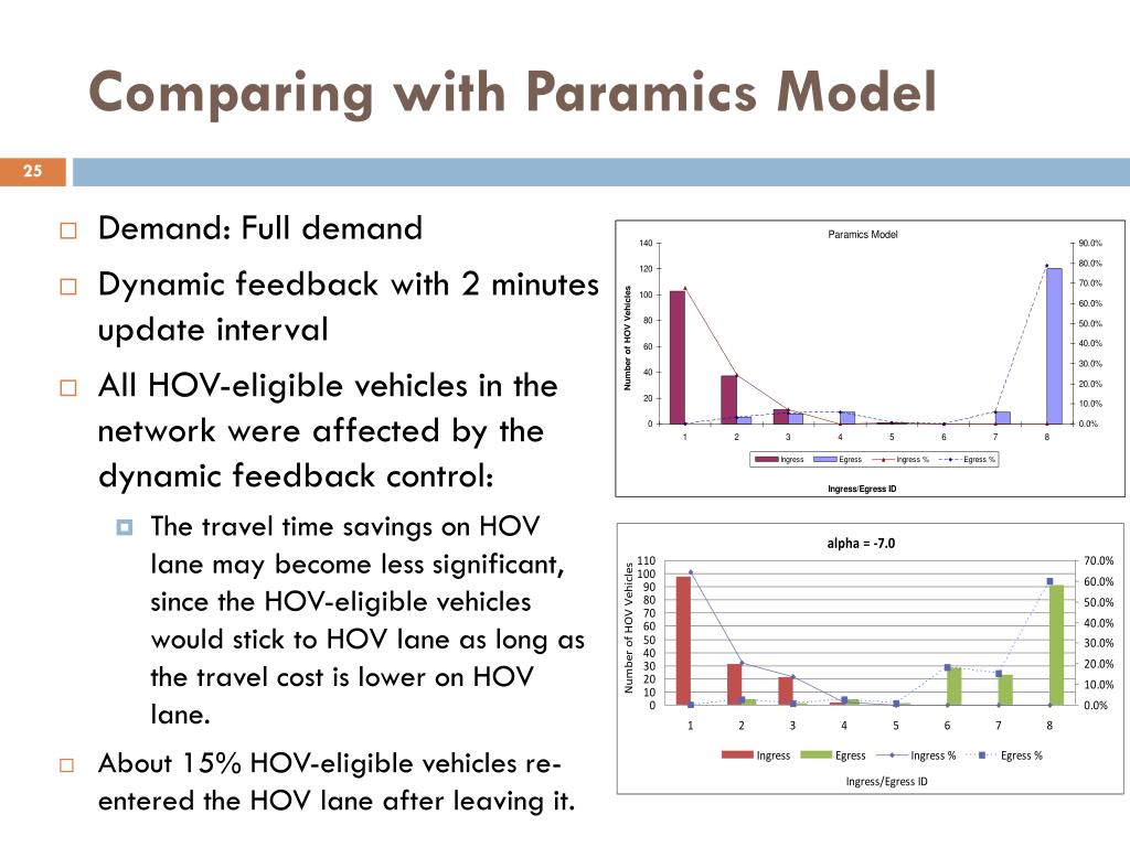 Comparing with Paramics Model 25 • Demand: Full demand • Dynamic feedback with 2 minutes update interval • All HOV-eligible vehicles in the network were affected by the dynamic feedback control: • The travel time savings on HOV lane may become less significant, since the HOV-eligible vehicles would stick to HOV lane as long as the travel cost is lower on HOV lane. • About 15% HOV-eligible vehicles re-entered the HOV lane after leaving it.