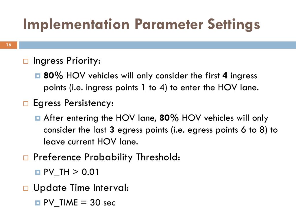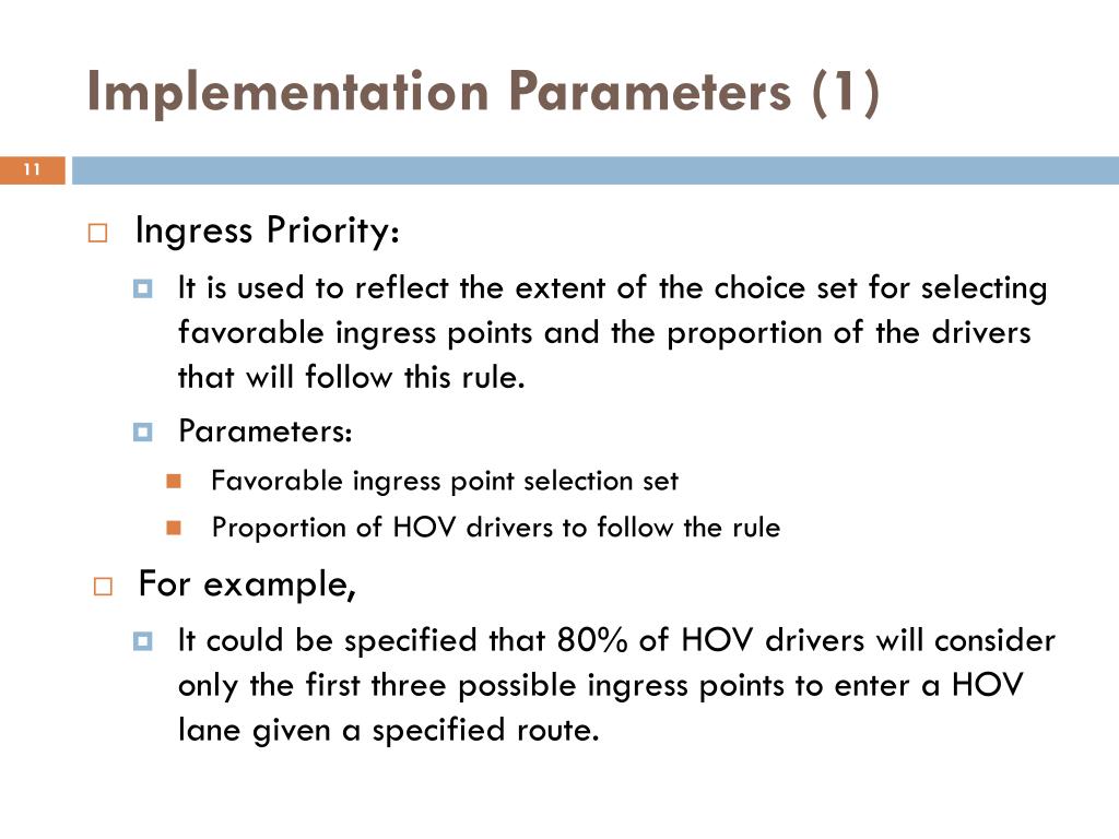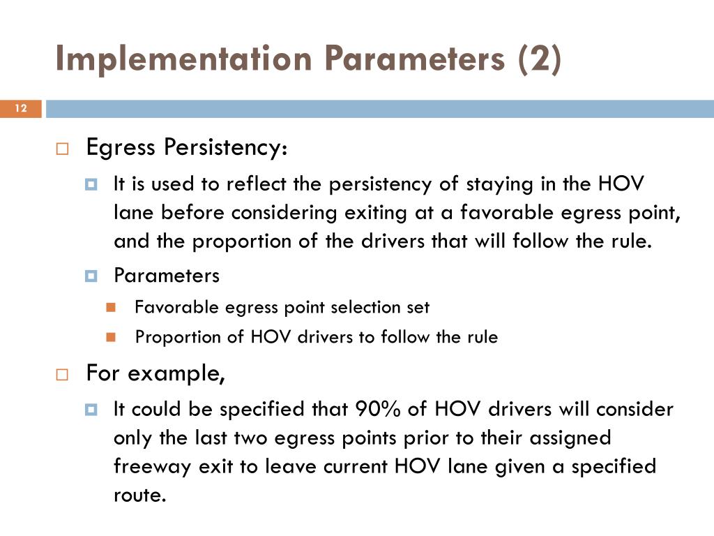 Implementation Parameters (1) 11 • Ingress Priority: • It is used to reflect the extent of the choice set for selecting favorable ingress points and the proportion of the drivers that will follow this rule. • Parameters: • Favorable ingress point selection set • Proportion of HOV drivers to follow the rule • For example, • It could be specified that 80% of HOV drivers will consider only the first three possible ingress points to enter a HOV lane given a specified route.