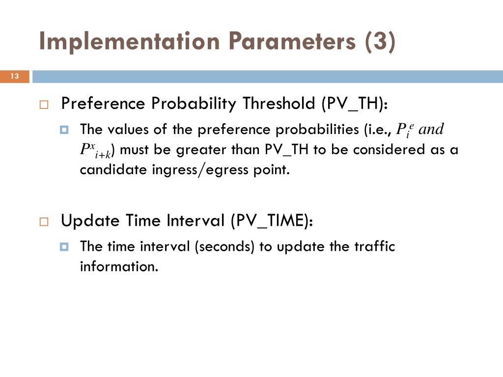 Implementation Parameters (2) 12 • Egress Persistency: • It is used to reflect the persistency of staying in the HOV lane before considering exiting at a favorable egress point, and the proportion of the drivers that will follow the rule. • Parameters • Favorable egress point selection set • Proportion of HOV drivers to follow the rule • For example, • It could be specified that 90% of HOV drivers will consider only the last two egress points prior to their assigned freeway exit to leave current HOV lane given a specified route.