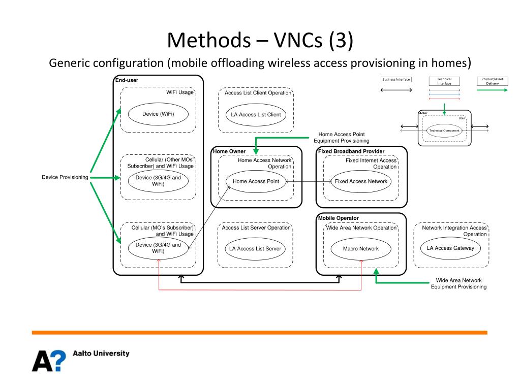 Methods – VNCs (1) • Identifying roles (key), actors and technical components • Forming business and technical interfaces • Technical Interfaces • Black interface: A connection between technical components (general) • Blue interface: WiFiconnection • Red interface: Cellular (3GPP) connection
