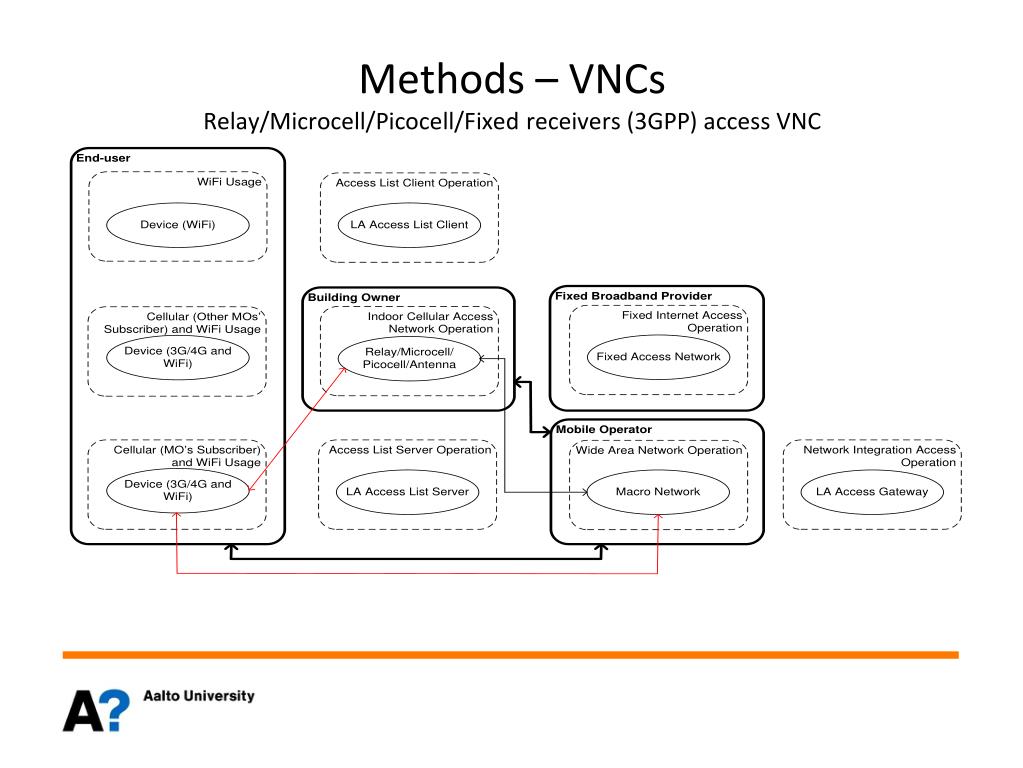 Methods – VNCs (2)indoor technical solutions • WiFi, femtocell, picocell, microcell, distributed antenna system, relays, fixed receivers Roles • WiFi usage • Devices connected to internet via WiFi • Cellular usage • Devices connected to internet via mobile broadband • Access list client operation • Devices request to connect via the home access point • Access list server operation • Responding to requests by client • Home access network operation • Connection to internet via home access point • Fixed internet access operation • Providing fixed internet access • Wide area network operation • Providing mobile broadband and coverage • Network integration access operation • Integration of home and wide area networks