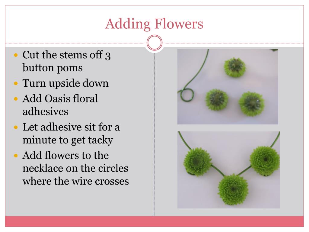 Adding Flowers Cut the stems off 3 button poms Turn upside down Add Oasis floral adhesives Let adhesive sit for a minute to get tacky Add flowers to the necklace on the circles where the wire crosses