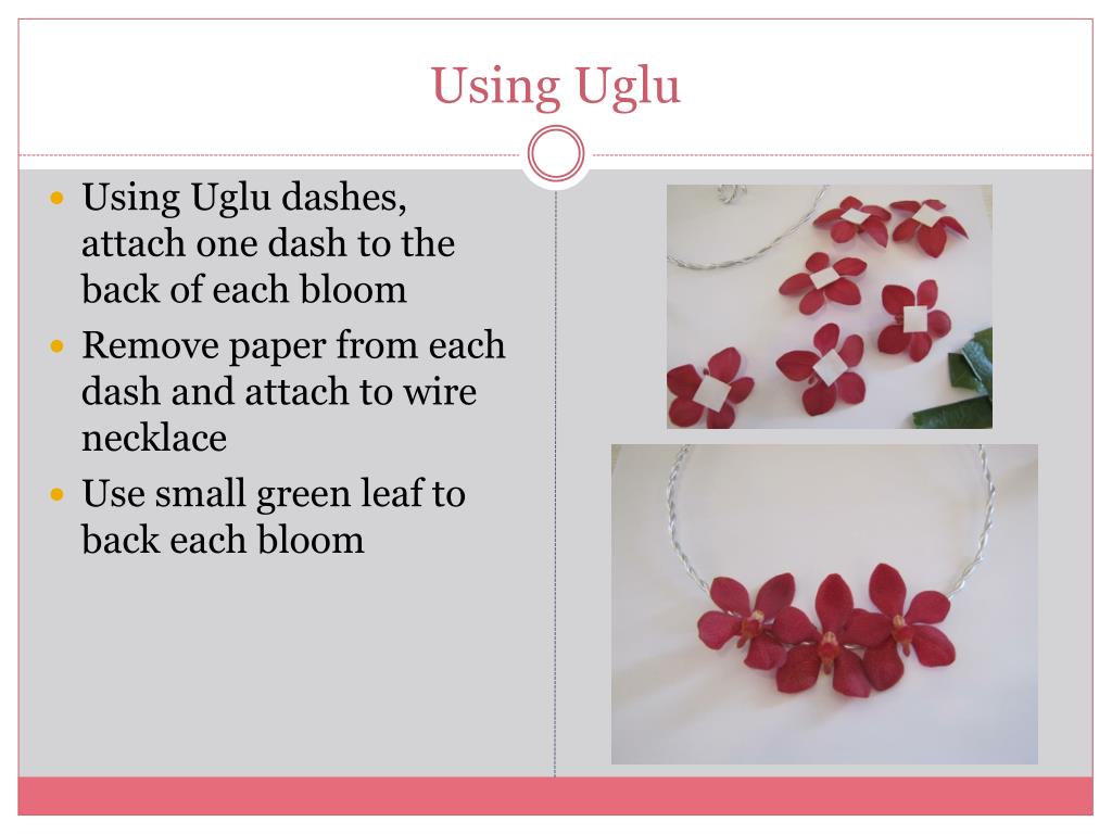 Using Uglu Using Uglu dashes, attach one dash to the back of each bloom Remove paper from each dash and attach to wire necklace Use small green leaf to back each bloom