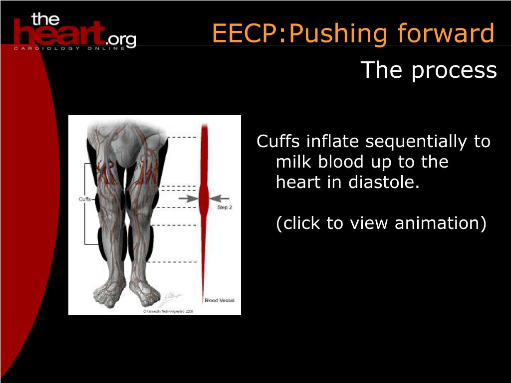 EECP:Pushing forward The process • Cuffs inflate sequentially to milk blood up to the heart in diastole. • (click to view animation)