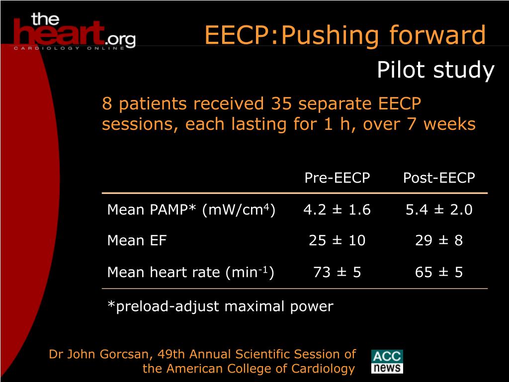 EECP:Pushing forward Pilot study 8 patients received 35 separate EECPsessions, each lasting for 1 h, over 7 weeks Dr John Gorcsan, 49th Annual Scientific Session of the American College of Cardiology