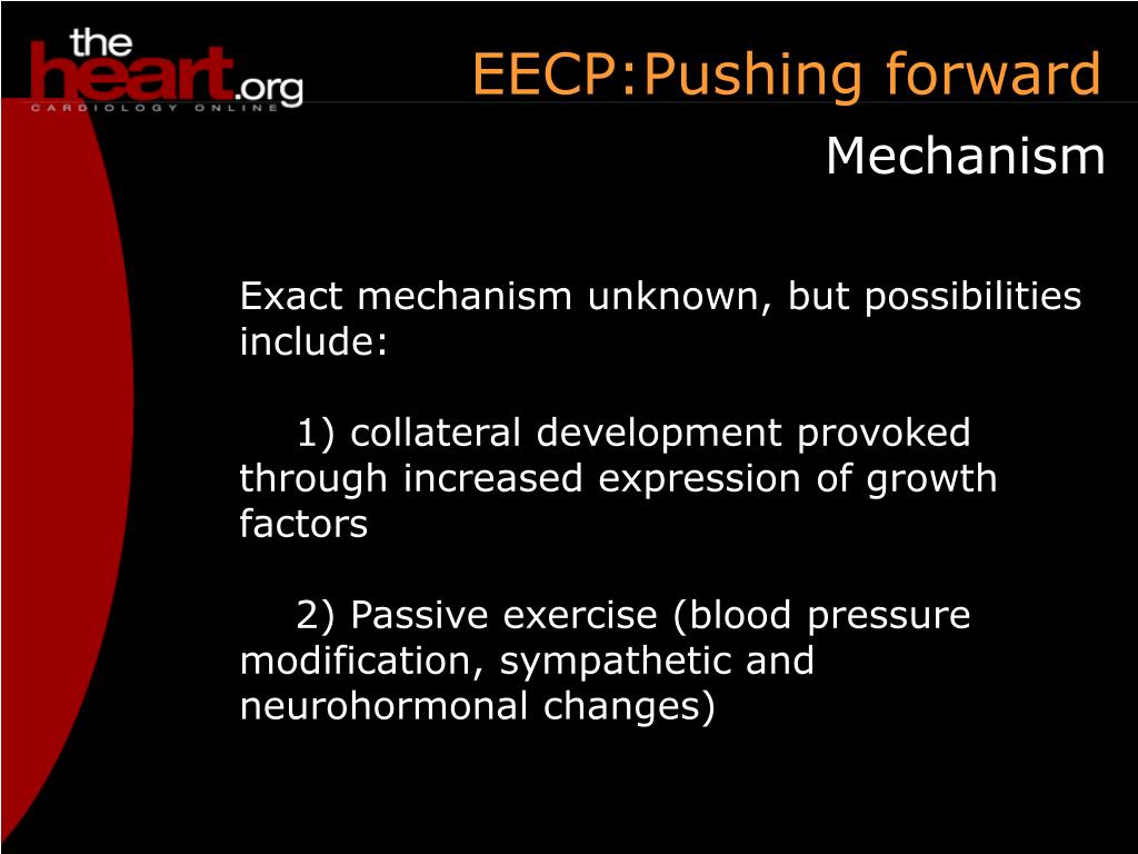 EECP:Pushing forward Mechanism Exact mechanism unknown, but possibilities include: 1) collateral development provoked through increased expression of growth factors 2) Passive exercise (blood pressure modification, sympathetic and neurohormonal changes)