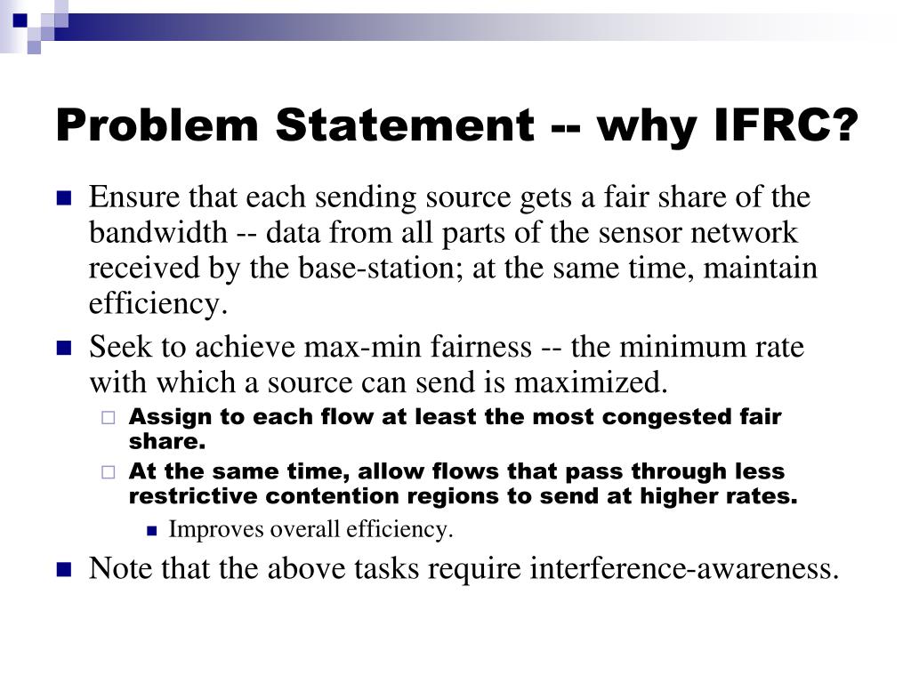 Problem Statement -- why IFRC? • Ensure that each sending source gets a fair share of the bandwidth -- data from all parts of the sensor network received by the base-station; at the same time, maintain efficiency. • Seek to achieve max-min fairness -- the minimum rate with which a source can send is maximized. • Assign to each flow at least the most congested fair share. • At the same time, allow flows that pass through less restrictive contention regions to send at higher rates. • Improves overall efficiency. • Note that the above tasks require interference-awareness.
