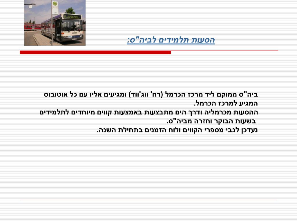 הסעות תלמידים לביה"ס: ביה"ס ממוקם ליד מרכז הכרמל (רח' ווג'ווד) ומגיעים אליו עם כל אוטובוס המגיע למרכז הכרמל. ההסעות מכרמליה ודרך הים מתבצעות באמצעות קווים מיוחדים לתלמידים בשעות הבוקר וחזרה מביה"ס. נעדכן לגבי מספרי הקווים ולוח הזמנים בתחילת השנה.