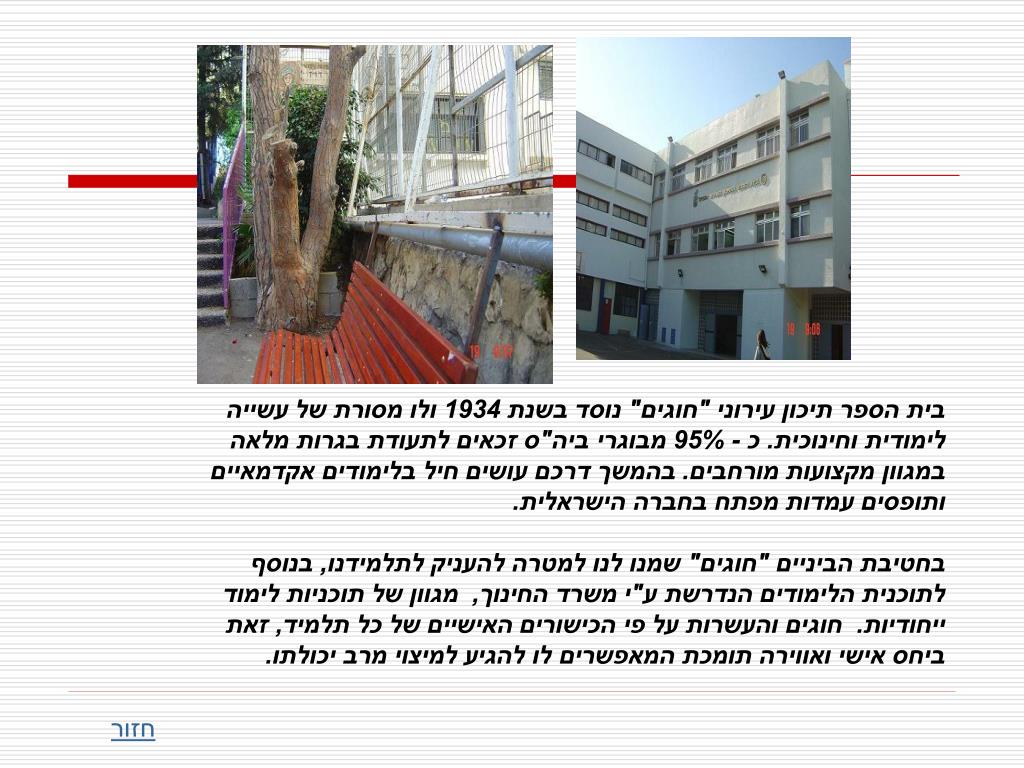 בית הספר תיכון עירוני "חוגים" נוסד בשנת 1934 ולו מסורת של עשייה לימודית וחינוכית. כ - 95% מבוגרי ביה"ס זכאים לתעודת בגרות מלאה במגוון מקצועות מורחבים. בהמשך דרכם עושים חיל בלימודים אקדמאיים ותופסים עמדות מפתח בחברה הישראלית. בחטיבת הביניים "חוגים" שמנו לנו למטרה להעניק לתלמידנו, בנוסף לתוכנית הלימודים הנדרשת ע"י משרד החינוך, מגוון של תוכניות לימוד ייחודיות. חוגים והעשרות על פי הכישורים האישיים של כל תלמיד, זאת ביחס אישי ואווירה תומכת המאפשרים לו להגיע למיצוי מרב יכולתו. חזור