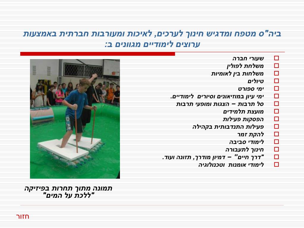 ביה"ס מטפח ומדגיש חינוך לערכים, לאיכות ומעורבות חברתית באמצעות ערוצים לימודיים מגוונים ב: • שעורי חברה • משלחת לפולין • משלחות בין לאומיות • טיולים • ימי ספורט • ימי עיון במוזיאונים וסיורים לימודיים. • סל תרבות – הצגות ומופעי תרבות • מועצת תלמידים • הפסקות פעילות • פעילות התנדבותית בקהילה • להקת זמר • לימודי סביבה • חינוך לתעבורה • "דרך חיים" – דמיון מודרך, תזונה ועוד. • לימודי אומנות וטכנולוגיה תמונה מתוך תחרות בפיזיקה "ללכת על המים" חזור