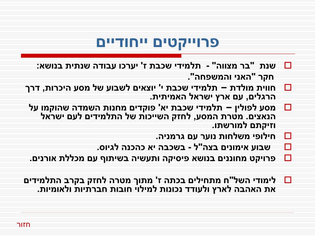 פרוייקטים ייחודיים • שנת "בר מצווה" - תלמידי שכבת ז' יערכו עבודה שנתית בנושא: חקר "האני והמשפחה". • חווית מולדת – תלמידי שכבת י' יוצאים לשבוע של מסע היכרות, דרך הרגלים, עם ארץ ישראל האמיתית. • מסע לפולין – תלמידי שכבת יא' פוקדים מחנות השמדה שהוקמו על הנאצים. מטרת המסע, לחזק השייכות של התלמידים לעם ישראל וזיקתם למורשתו. • חילופי משלחות נוער עם גרמניה. • שבוע אימונים בצה"ל - בשכבה יא כהכנה לגיוס. • פרויקט מחוננים בנושא פיסיקה ותעשיה בשיתוף עם מכללת אורנים. • לימודי השל"ח מתחילים בכתה ז' מתוך מטרה לחזק בקרב התלמידים את האהבה לארץ ולעודד נכונות למילוי חובות חברתיות ולאומיות. חזור