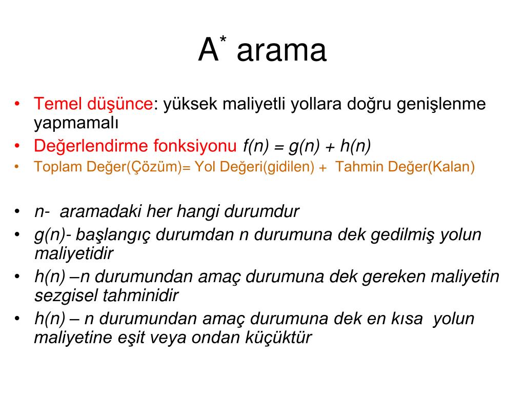 A*arama • Temel düşünce:yüksek maliyetli yollara doğru genişlenme yapmamalıDeğerlendirme fonksiyonuf(n) = g(n) + h(n)Toplam Değer(Çözüm)= Yol Değeri(gidilen) + Tahmin Değer(Kalan) • n- aramadaki her hangi durumdur • g(n)- başlangıç durumdan n durumuna dek gedilmiş yolun maliyetidir • h(n) –n durumundan amaç durumuna dek gereken maliyetin sezgisel tahminidir • h(n) – n durumundan amaç durumuna dek en kısa yolun maliyetine eşit veya ondan küçüktür