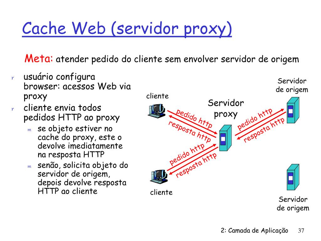 usuário configura browser: acessos Web via proxy cliente envia todos pedidos HTTP ao proxy se objeto estiver no cache do proxy, este o devolve imediatamente na resposta HTTP senão, solicita objeto do servidor de origem, depois devolve resposta HTTP ao cliente Cache Web (servidor proxy) Meta: atender pedido do cliente sem envolver servidor de origem Servidorde origem cliente Servidorproxy pedido http pedido http resposta http resposta http pedido http resposta http cliente Servidorde origem 2: Camada de Aplicação