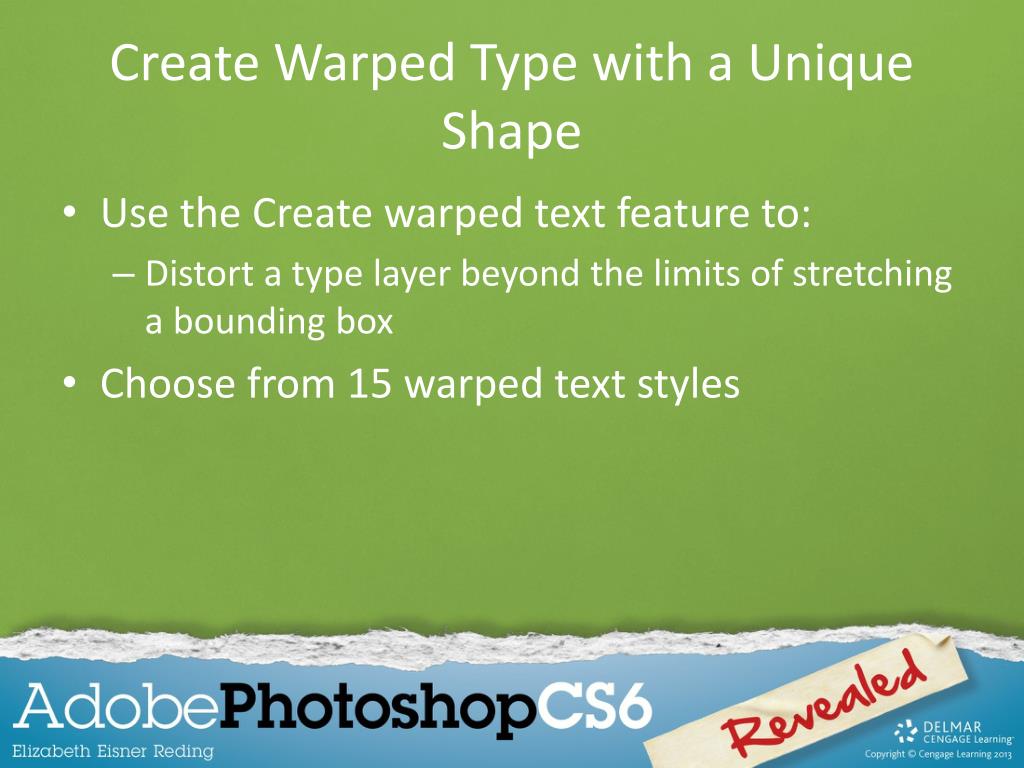 Create Warped Type with a Unique Shape • Use the Create warped text feature to: • Distort a type layer beyond the limits of stretching a bounding box • Choose from 15 warped text styles