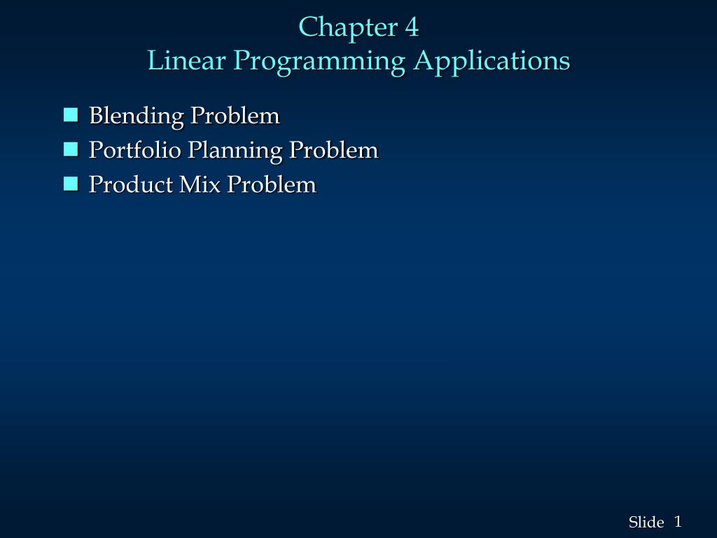 Chapter 4 Linear Programming Applications • Blending Problem • Portfolio Planning Problem • Product Mix Problem