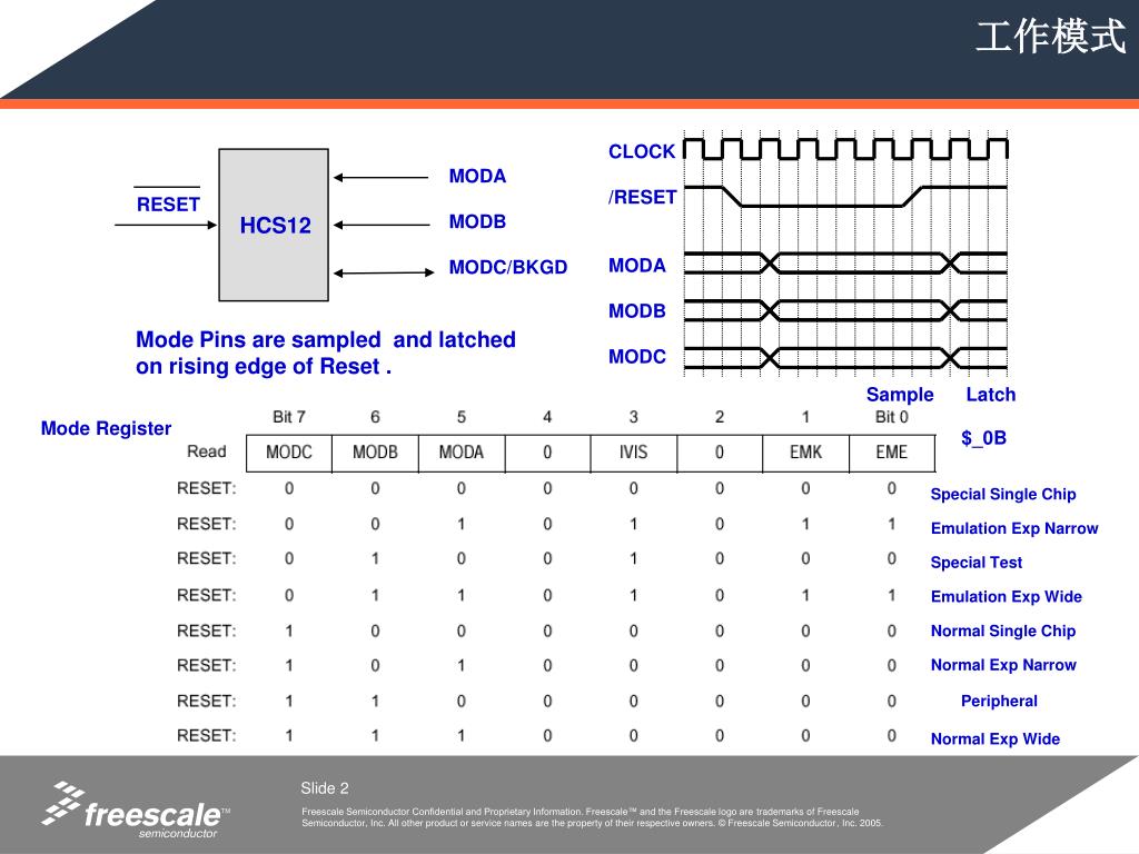 Mode Register $_0B Special Single Chip Emulation Exp Narrow Special Test Emulation Exp Wide Normal Single Chip Normal Exp Narrow Peripheral Normal Exp Wide 工作模式 CLOCK /RESET MODA MODB MODC MODA MODB MODC/BKGD RESET HCS12 Mode Pins are sampled and latched on rising edge of Reset . Sample Latch