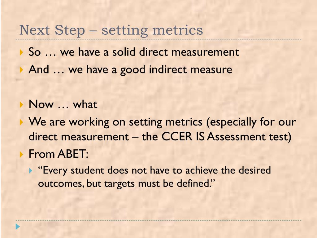Next Step – setting metrics • So … we have a solid direct measurement • And … we have a good indirect measure • Now … what • We are working on setting metrics (especially for our direct measurement – the CCER IS Assessment test) • From ABET: • “Every student does not have to achieve the desired outcomes, but targets must be defined.”