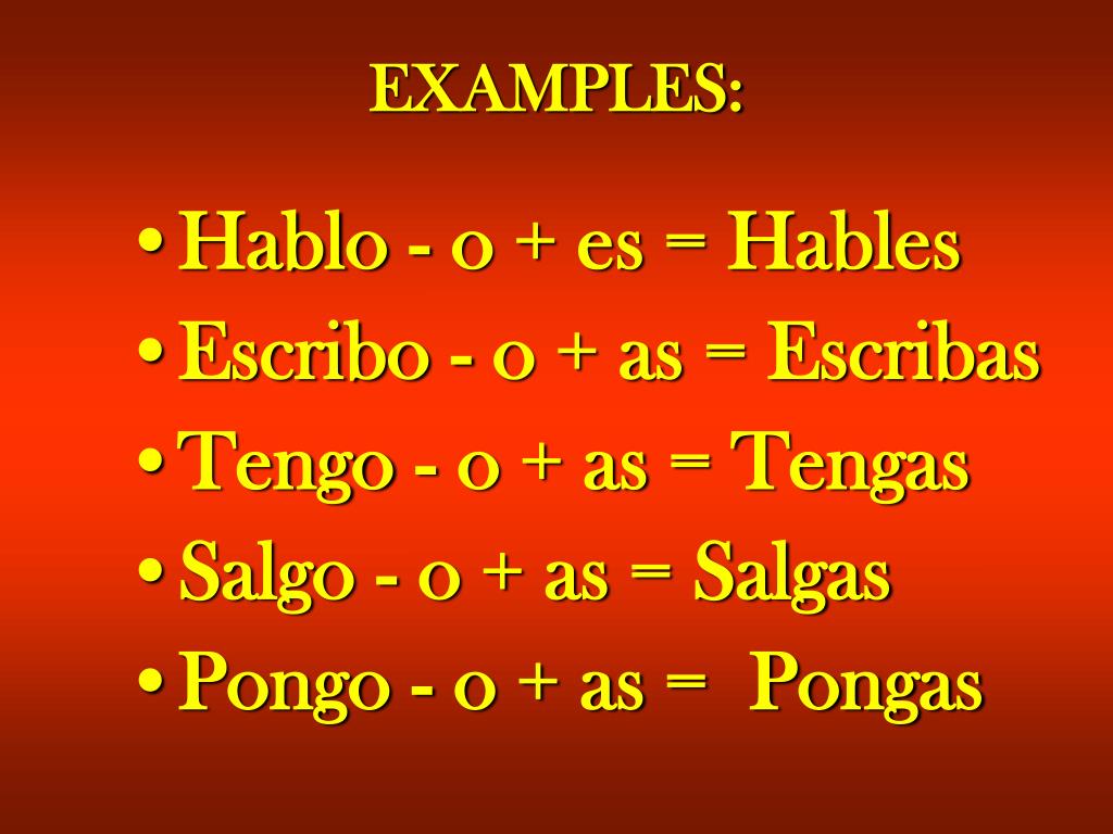 EXAMPLES: • Hablo - o + es = Hables • Escribo - o + as = Escribas • Tengo - o + as = Tengas • Salgo - o + as = Salgas • Pongo - o + as = Pongas