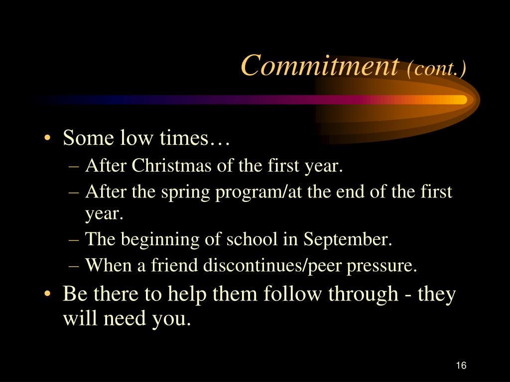 Commitment (cont.) • Some low times… • After Christmas of the first year. • After the spring program/at the end of the first year. • The beginning of school in September. • When a friend discontinues/peer pressure. • Be there to help them follow through - they will need you.