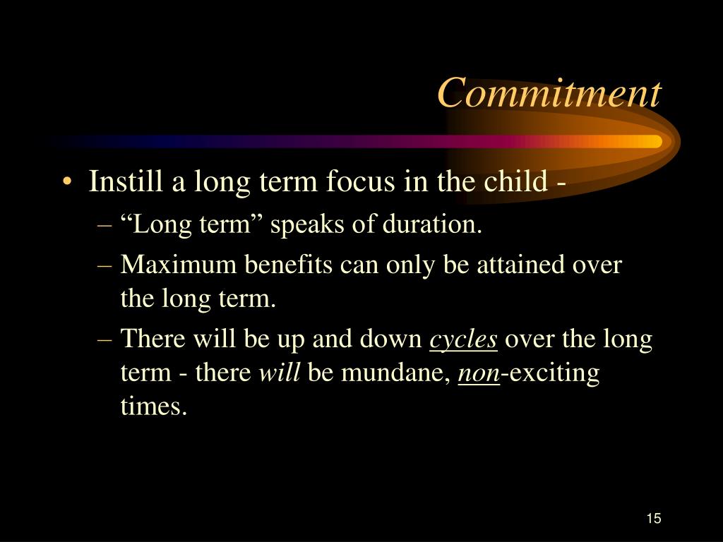 Commitment • Instill a long term focus in the child - • “Long term” speaks of duration. • Maximum benefits can only be attained over the long term. • There will be up and down cycles over the long term - there will be mundane, non-exciting times.