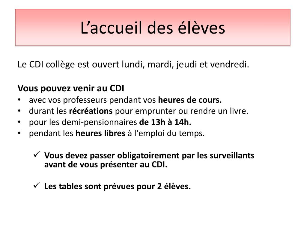 L’accueil des élèves • Le CDI collège est ouvert lundi, mardi, jeudi et vendredi. • Vous pouvez venir au CDI • avec vos professeurs pendant vos heures de cours. • durant les récréations pour emprunter ou rendre un livre. • pour les demi-pensionnaires de 13h à 14h. • pendant les heures libres à l'emploi du temps. • Vous devez passer obligatoirement par les surveillants avant de vous présenter au CDI. • Les tables sont prévues pour 2 élèves.