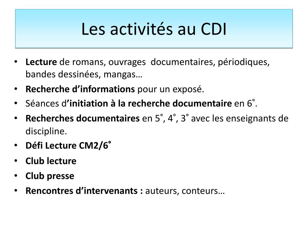 Les activités au CDI • Lecture de romans, ouvrages documentaires, périodiques, bandes dessinées, mangas… • Recherche d’informations pour un exposé. • Séances d’initiation à la recherche documentaire en 6°. • Recherches documentaires en 5°, 4°, 3° avec les enseignants de discipline. • Défi Lecture CM2/6° • Club lecture • Club presse • Rencontres d’intervenants : auteurs, conteurs…
