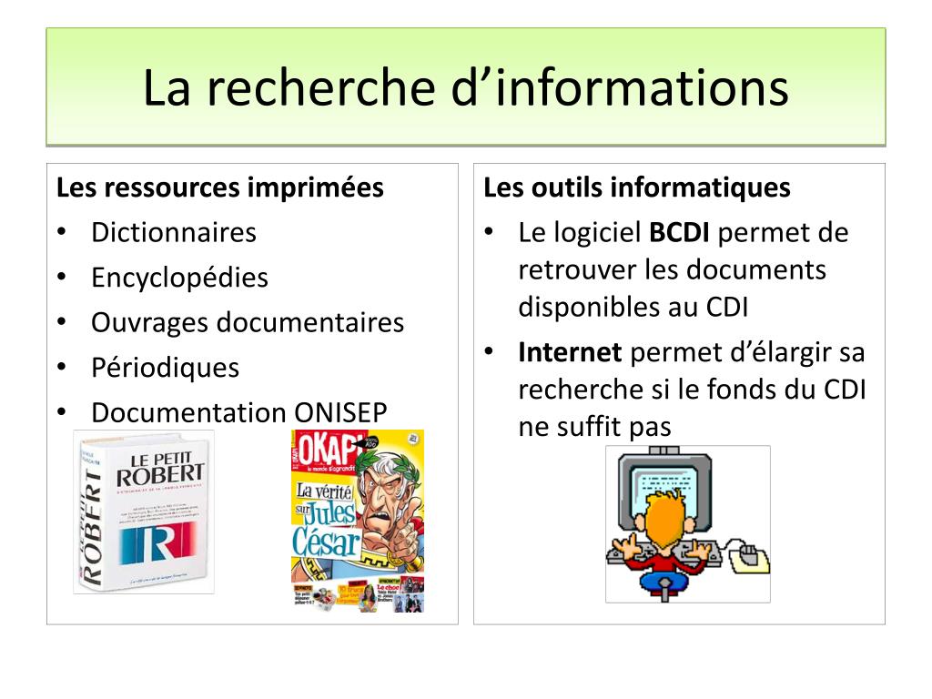 La recherche d’informations • Les ressources imprimées • Dictionnaires • Encyclopédies • Ouvrages documentaires • Périodiques • Documentation ONISEP • Les outils informatiques • Le logiciel BCDI permet de retrouver les documents disponibles au CDI • Internet permet d’élargir sa recherche si le fonds du CDI ne suffit pas