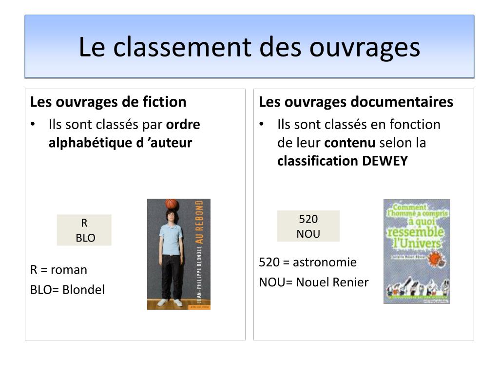 Le classement des ouvrages • Les ouvrages de fiction • Ils sont classés par ordre alphabétique d ’auteur • R = roman • BLO= Blondel • Les ouvrages documentaires • Ils sont classés en fonction de leur contenu selon la classification DEWEY • 520 = astronomie • NOU= Nouel Renier 520 NOU R BLO
