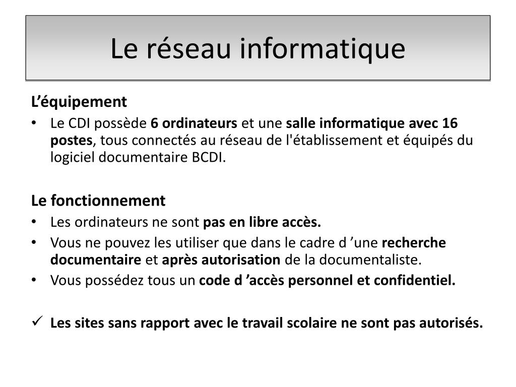 Le réseau informatique • L’équipement • Le CDI possède 6 ordinateurs etune salle informatique avec 16 postes, tous connectés au réseau de l'établissement et équipés du logiciel documentaire BCDI. • Le fonctionnement • Les ordinateurs ne sont pas en libre accès. • Vous ne pouvez les utiliser que dans le cadre d ’une recherche documentaire et après autorisation de la documentaliste. • Vous possédez tous un code d ’accès personnel et confidentiel. • Les sites sans rapport avec le travail scolaire ne sont pas autorisés.