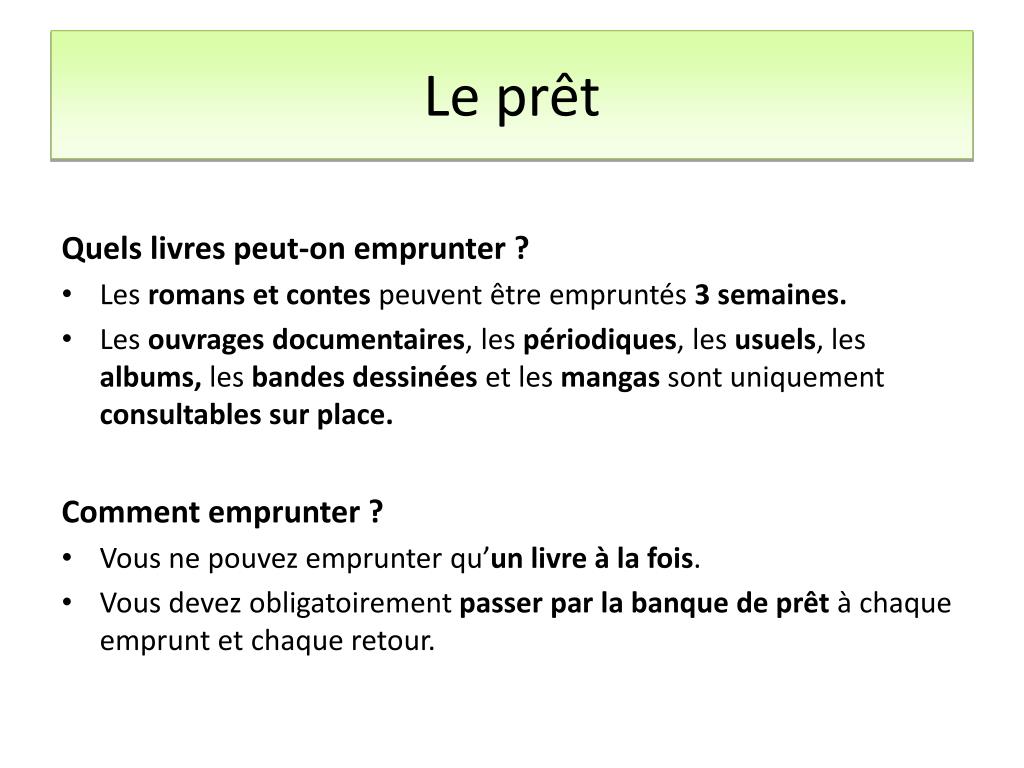 Le prêt • Quels livres peut-on emprunter ? • Les romans et contes peuvent être empruntés 3 semaines. • Les ouvrages documentaires, les périodiques, les usuels, les albums, les bandes dessinées et les mangas sont uniquement consultables sur place. • Comment emprunter ? • Vous ne pouvez emprunter qu’un livre à la fois. • Vous devez obligatoirement passer par la banque de prêt à chaque emprunt et chaque retour.