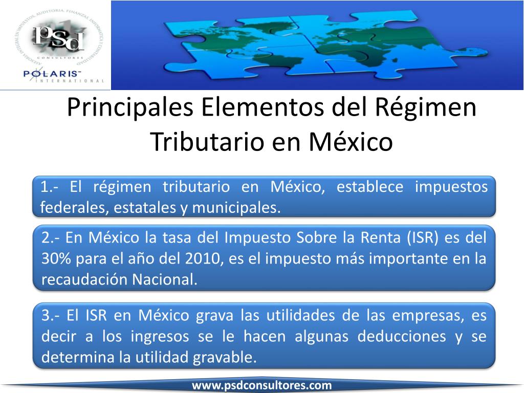 Principales Elementos del Régimen Tributario en México 1.- El régimen tributario en México, establece impuestos federales, estatales y municipales. 2.- En México la tasa del Impuesto Sobre la Renta (ISR) es del 30% para el año del 2010, es el impuesto más importante en la recaudación Nacional. 3.- El ISR en México grava las utilidades de las empresas, es decir a los ingresos se le hacen algunas deducciones y se determina la utilidad gravable. www.psdconsultores.com