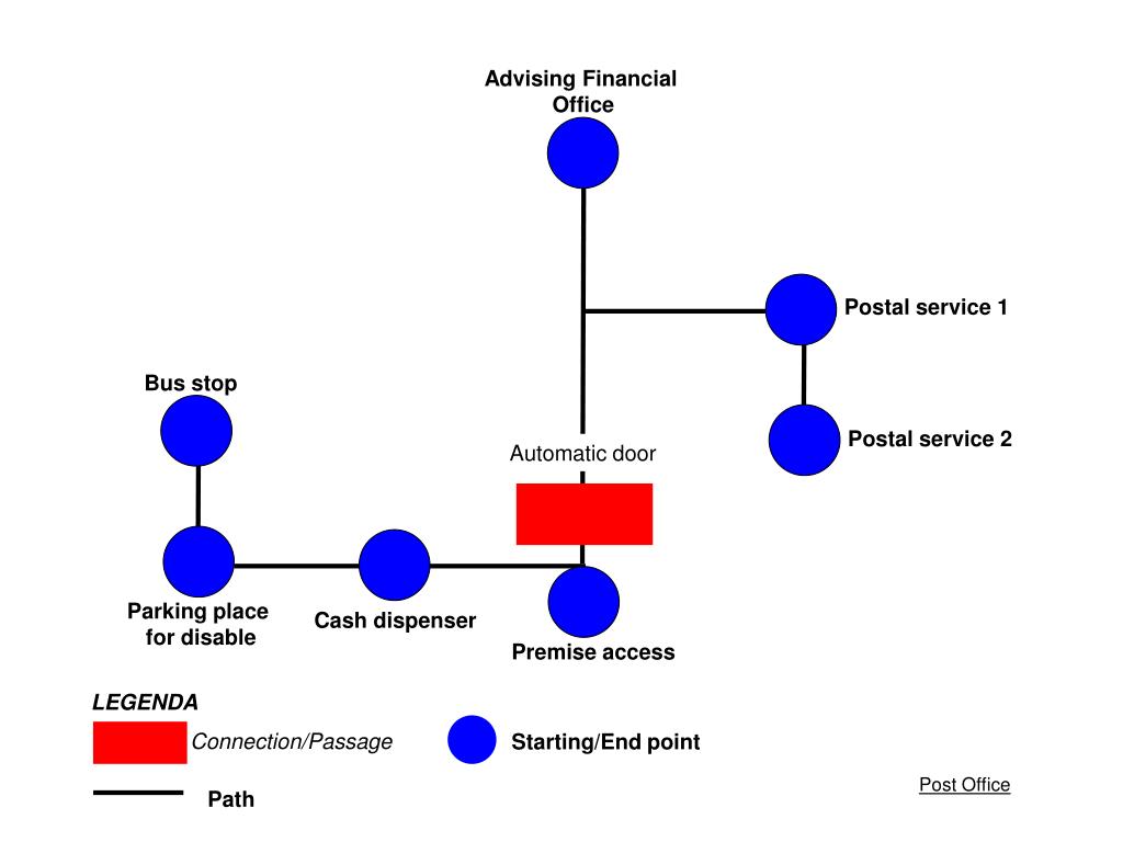 LEGENDA Connection/Passage Starting/End point Path Advising Financial Office Postal service 1 Bus stop Postal service 2 Automatic door Parking place for disable Cash dispenser Premise access Post Office